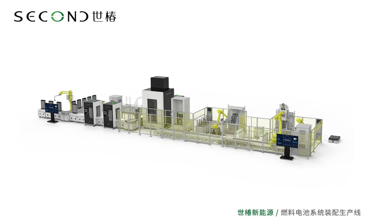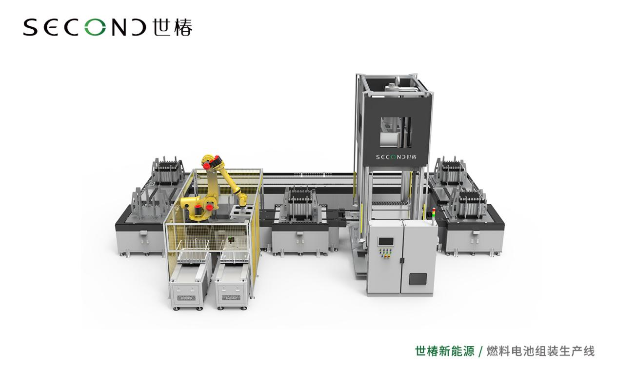 2021年至今,在膜电极整线设备的机器人应用环节完成研发后,新能源机器人应用技术研发团队将精力放在了极板生产及整堆装堆上。以成熟的装堆设备“燃料电池系统装配生产线”为例,新能源使用CCD对膜电极及石墨板进行位置定位,精度可达到±0.1mm,在计算完整个环节的设备误差后仍能达到±0.3mm的精度。而在整个装堆环节,在使用高速六轴机器人配合双工位平台的情况下,单片堆叠平均用时可达到10S/片。在装堆的同时,其还保持产品二维码读取、产品尺寸检测、产品多张检测等功能。整线采用MES系统管控,生产节拍在4-6台/时灵活变动。生产线采用机器人自动上电堆,全自动合装电堆,机器人自动下料,AGV自动回流,机器人视觉自动对位校正,并且将合装完毕的电堆组件自动入箱,整个过程自动化程度非常高。