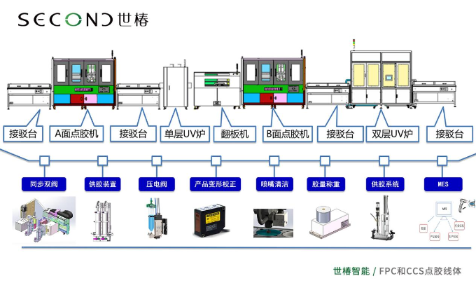 主要设备涵括:悬臂式在线自动点胶系列设备、龙门式在线自动点胶系列设备、双臂协作在线自动点胶系列设备、FPC和CCS点胶线体等。设备同时亦具备视觉定位、产品变形校正、双阀位置自动校正、双阀同步点胶、点胶效果检测、胶量自动点检、喷头自动清洁、MES系统等丰富的功能,在保障点胶品质的同时,也实现产品的可追溯性。