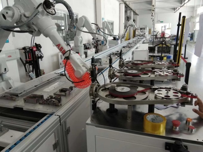 三是贴胶带机构中,新型高精度贴胶盘通用性、互换性更强,贴胶带精度更高,实现了胶盘自动切换和±0.5mm误差,可实现不停机快速换料,运行过程不需要人员干预,减少人力投入,生产效率倍增。该贴胶盘,体型小且重量下降,机器人系统所需的负载能力相应降低,成本也大大下降。
