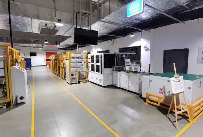 整个粘胶车间干净整洁,自动检测工序正在视觉识别产品型号;六轴机器人正在自动贴胶带,自动识别胶带的余量,自动换胶盘;三轴机器人正在涂硅胶、涂热熔胶,机械手在轨道中穿梭,弧光飞舞;按动压合按钮,玻璃面板在流水线上快速压合,10秒后自动抬起 ……