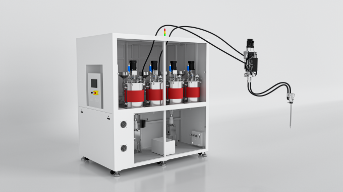 混合系统采用双组份点胶混合阀,双气缸控制,可单独控制A/B,采用回吸式结构,关阀后不滴胶、不拉丝、无漏胶现象。通用出胶头,可搭配标准静态混合管,配比例出胶头,测试比例方便。