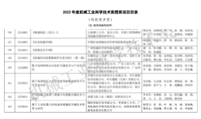 日前,2023年度中国“机械工业科学技术奖”拟授奖项目公示,共评出拟授奖项目429项,其中技术发明奖35项(一等奖14项、二等奖16项、三等奖5项),科技进步奖394项(特等奖2项、一等奖27项、二等奖174项、三等奖191项)。由国机智能科技有限公司、华南理工大学、广州机械科学研究院有限公司、共同申报的“基于工业机器人的高速高精施胶关键技术研究与应用”项目,荣获2023年度“机械工业科学技术奖·科技进步奖”二等奖。